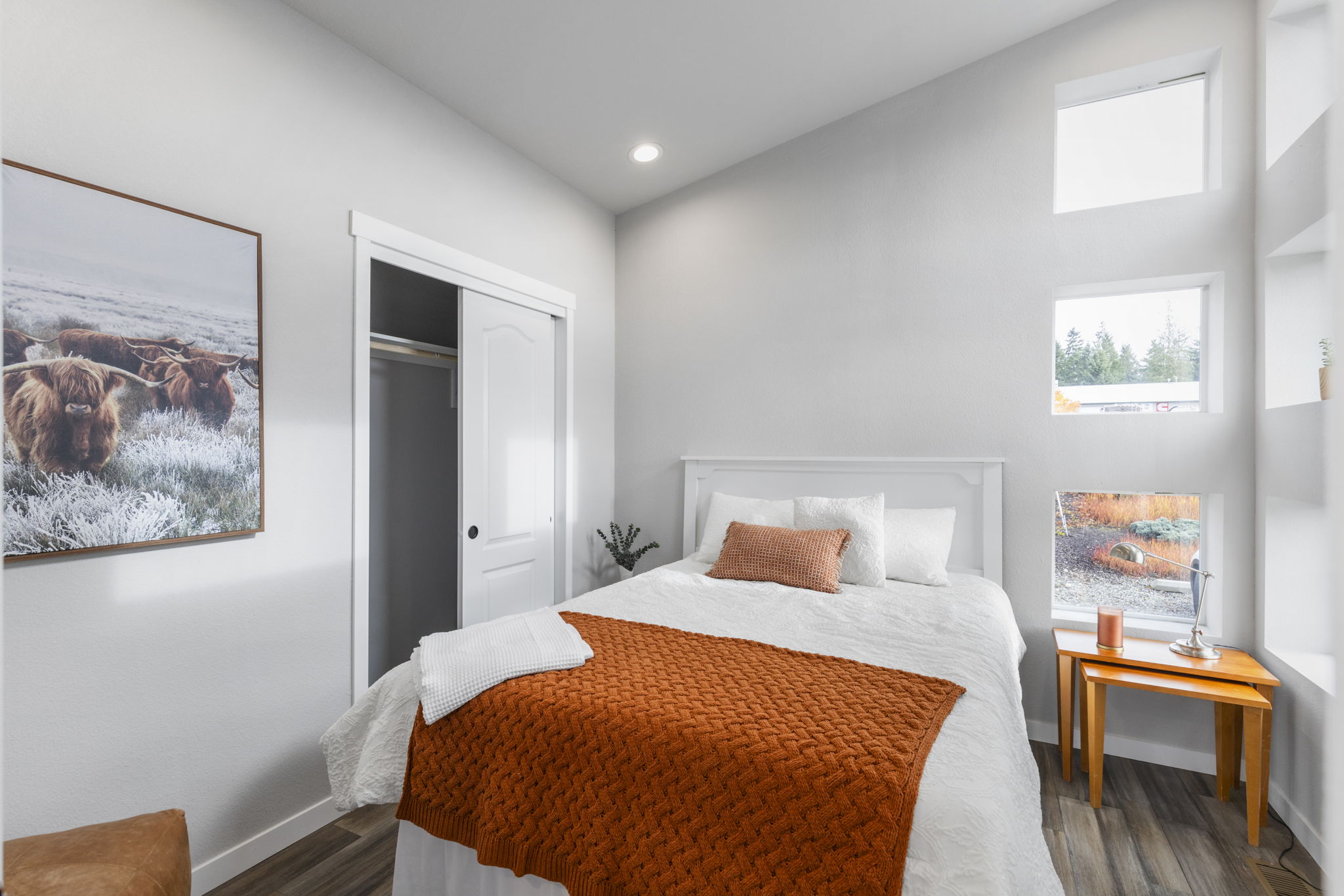 Small quality built home with big home style, features and efficiency boasts extra large windows with transoms allowing natural light to bathe and brighten the entire home; large living room open to beautiful well equipped big home kitchen with full size cabinets, fixtures and appliances; king size bedroom and bath with large walk-in shower.